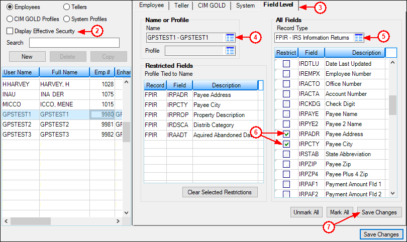 7.Click <Save Changes>. Those fields will be grayed out for the user/profile. For detailed information about each field in the IRS Information Returns record, see the Field Dictionary for the IRS Information Records in the Mnemonic Dictionary.