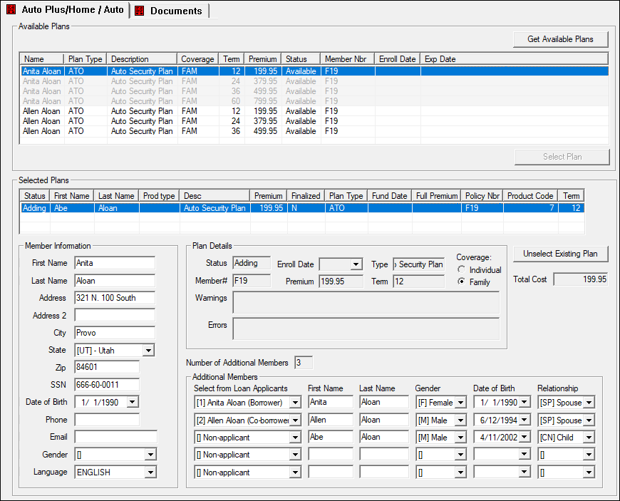 •Any member of the family, even if they are not on the loan, can be added to this screen for Family plans. •Plans that are offered are dependent on the office number for the loan. Office numbers help locate where the loan is being created, and therefore, different plans may be offered in different states/locations. •Once the loan is funded and boarded, the ancillary product will show in CIM GOLD under Loans > Optional Products > Ancillary Products. •All documents will be included with loan finalization.