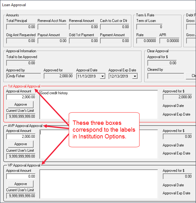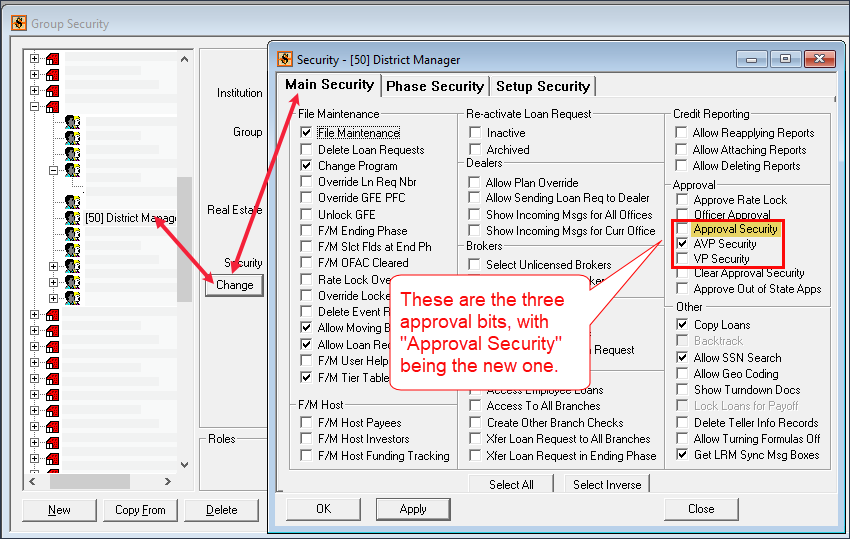 Problem: If either of the AVP or VP security bits are checked, the Approval section is grayed out and made unavailable. Only if both the AVP and VP security bits are not checked in the security group for a user will the Approval section be active for that user. One institution requires that three levels of approval be required on loans more than a set amount (such as $15,000). Therefore, we adjusted our system as follows.