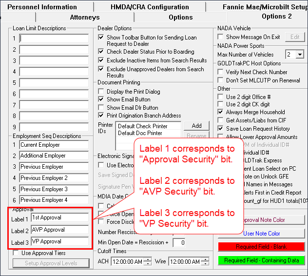 We have also added a new custom label for that new security bit in the Approval section of the Options 2 tab in GOLDTrak PC Setup > Institution Setup > Institution/Office Setup, as shown below: